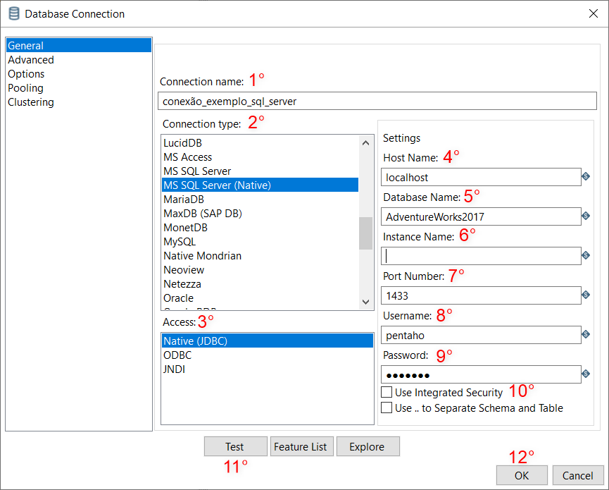 3. Access: aqui é o driver que você vai utilizar para a conexão. No nosso caso será o JDBC (baixe aqui o JDBC do SQL Server). OBS: para o JDBC ser reconhecido, você deve colocar na pasta do PDI, no caminho data-integration\lib. Depois reinicie o PDI.