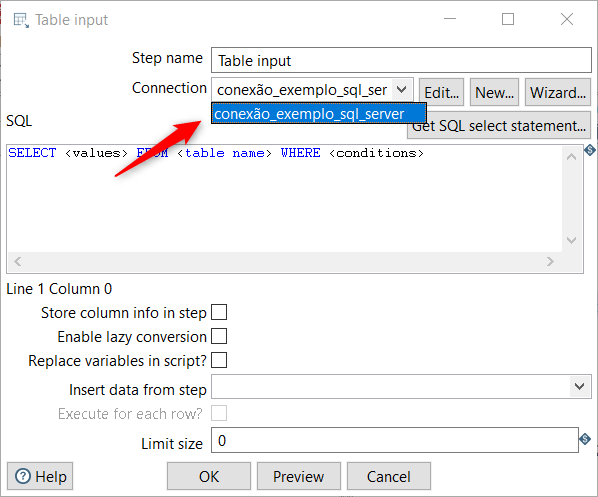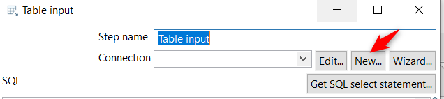 Criar uma nova conexão através do step Table Input