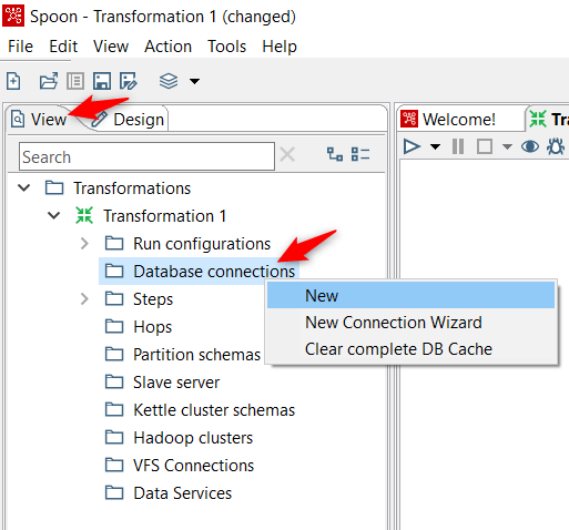 Ou podemos criar pelo menu View. Para isso basta ir na aba View e depois em Database connections e por fim clicar em New. Como na imagem abaixo: